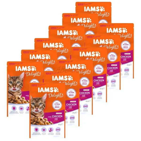 Iams kapsička pre staršie mačky od 7 rokov s obsahom kúskov kuracieho mäsa v omáčke.