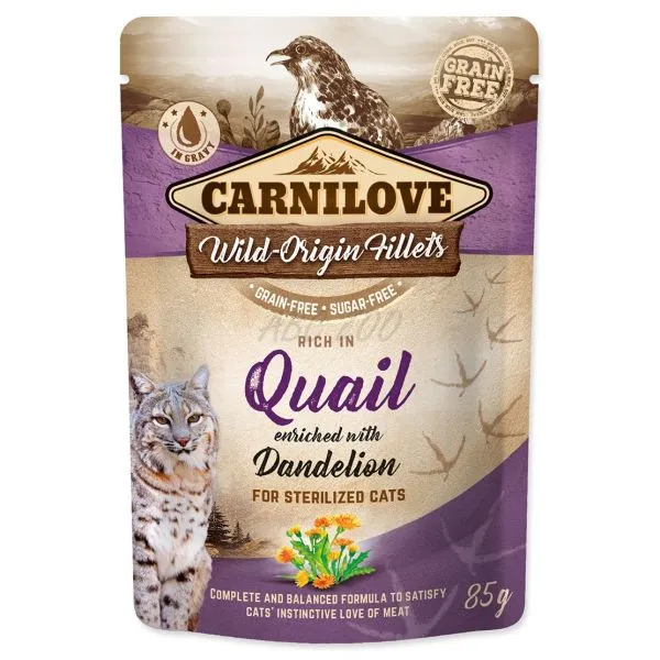 Carnilove je vlhké krmivo v kapsičke pre dospelé sterilizované mačky, s prepeličím mäsom a púpavou, bez obilnín či zemiakov.