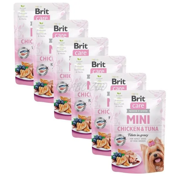 Brit Care Mini je kapsička plná filiet z kuracieho mäsa a tuniaka v chutnej omáčke, pre dospelé psy malých plemien.