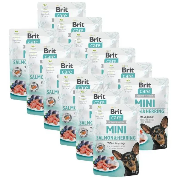 Brit Care Mini je kapsička plná filiet z lososa so sleďom v chutnej omáčke, pre dospelé sterilizované psy malých plemien.