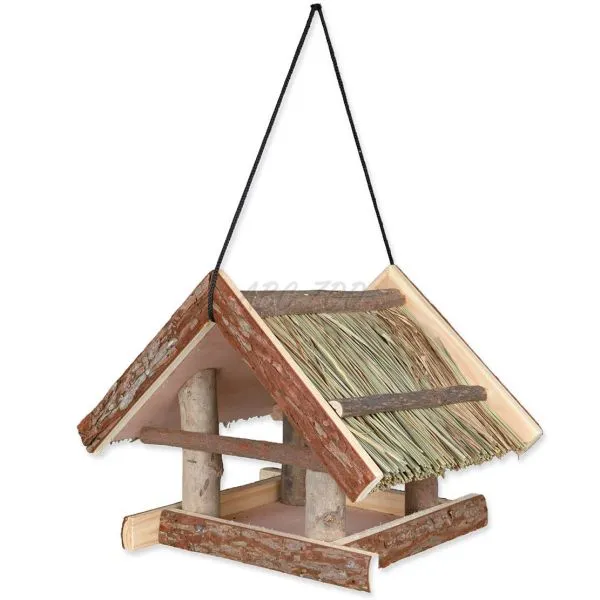 Závesné vonkajšie drevené krmítko so strechou z trávy pre vtáčiky.