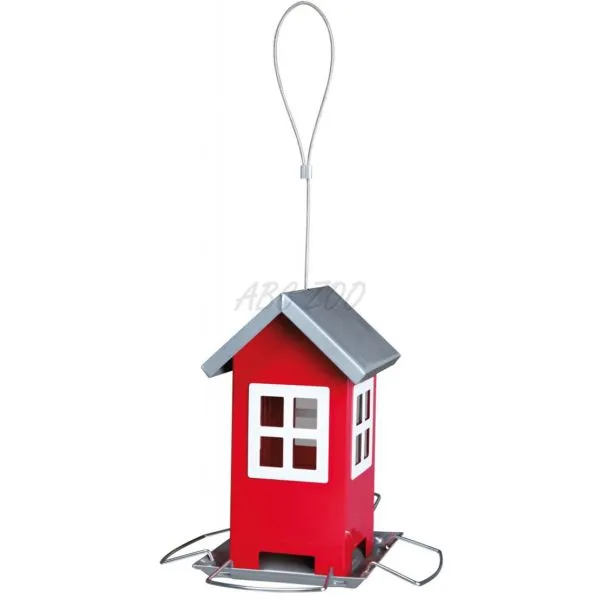 Závesné vonkajšie kovové krmítko so strieškou a okienkami pre vtáčiky.
