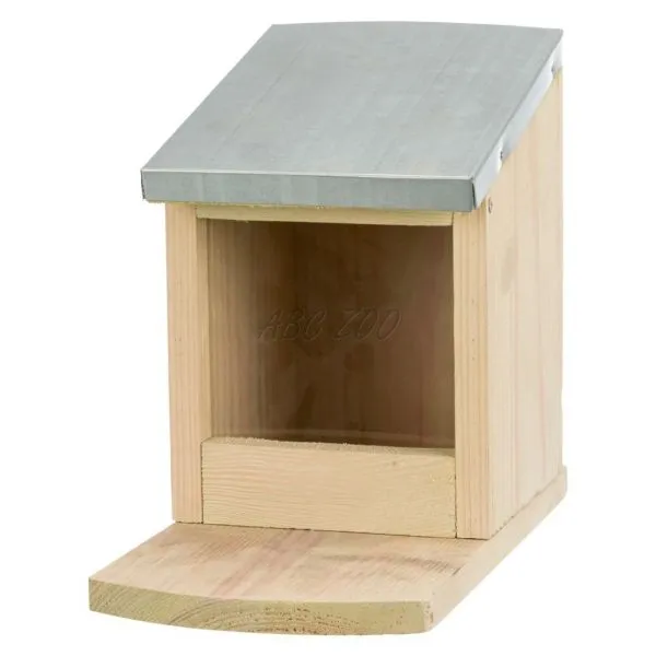 Vonkajšie drevené krmítko so strieškou pre veveričky.