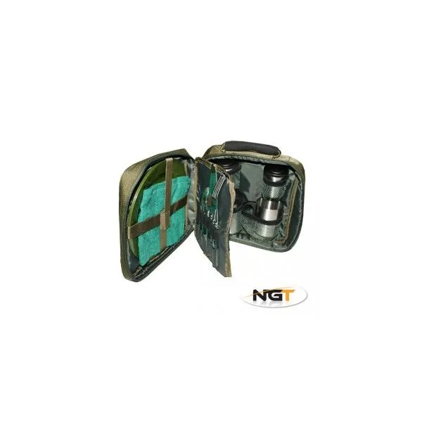 Set kvalitného jedálenského príslušenstva pre rybárčenie a kemping. Obsahuje utierku, taniere z veľmi odolného plastu, kompletný príbor, nerezové termo hrnčeky a nerezové dózy na cukor a soľ. Všetko je zabalené v kvalitnom polstrovanom puzdre so zipsom a transportným uchom.