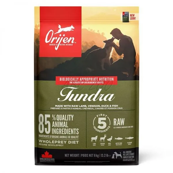 Receptúra Orijen Dog Tundra má vysoký obsah kozieho mäsa, proteínov z diviny, morských rýb a kačíc. Podporuje krásnu a lesklú srsť, zdravú kožu a predovšetkým perfektnú kondíciu dospelých psov všetkých plemien.