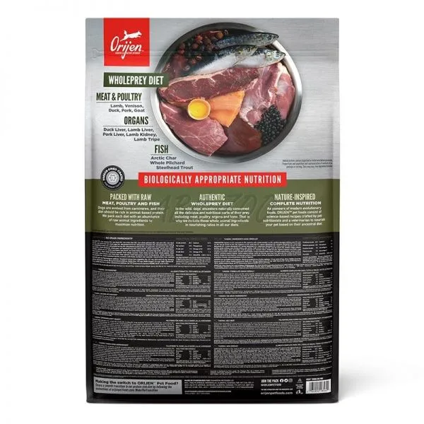 Psy ako mäsožravce sú prispôsobené strave, ktorá je založená na bohatom a rozmanitom obsahu celého čerstvého mäsa, s menším množstvom ovocia, bobuľovín a tráv. Krmivo Orijen ponúka všetky výhody surovej stravy, tak ako by ju Vášmu psovi ponúkla sama príroda. Je šetrne sušené mrazom pre uchovávanie prirodzenej chuti čerstvých miestnych surovín.
