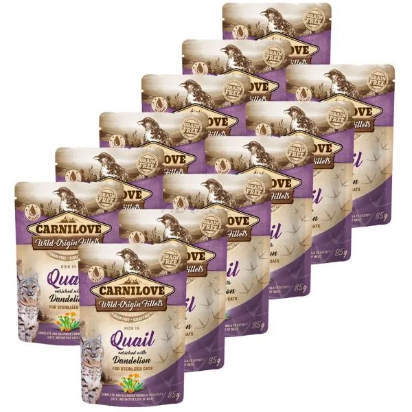 Carnilove je vlhké krmivo v kapsičke pre dospelé sterilizované mačky, s prepeličím mäsom a púpavou, bez obilnín či zemiakov.
