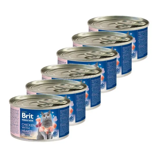 Brit je kompletné krmivo z kuracieho mäsa so srdiečkami v konzerve, pre dospelé mačky.