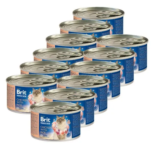 Brit je kompletné krmivo z kuracieho mäsa s ryžou v konzerve, pre dospelé mačky.
