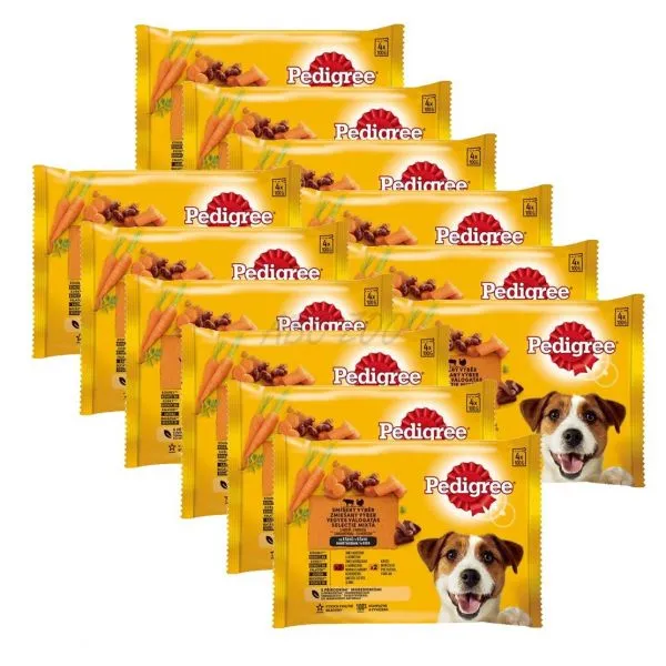 Krmivo Pedigree je vyvážené mokré krmivo s hovädzím, jahňacím a morčacím mäsom so zeleninou v šťave pre dospelé psy všetkých plemien.