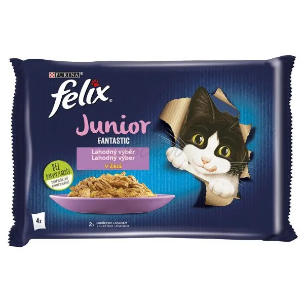 FELIX® Fantastic Junior je rad neodolateľných krmív, ktoré vyzerajú, voňajú a chutia tak lahodne ako jedlo, ktoré by ste sami uvarili! Každá receptúra, vyrobená z kvalitných surovín, obsahuje krehké kúsky v želé, aby sa vaše mačiatko mohlo do chutného krmiva poriadne zahryznúť! Mačiatka potrebujú, počas prvého roka ich života, špeciálnu výživu. Preto je každá receptúra špeciálne navrhnutá tak, aby pokryla 100 % denných potrieb vášho mačiatka. Sú plné bielkovín a vitamínov, aby pomohli rastu silných svalov, kostí a zubov pre šťastnú a nezbednú dospelú mačku! Pozri návod na kŕmenie. To nie je všetko! FELIX Fantastic Junior je dostupný v celom rade lahodných receptúr v šťavnatom želé, aby každý deň uspokojil lásku vášho mačiatka po rozmanitosti. Skutočne chutia tak dobre, ako vyzerajú! FELIX je jednoducho neodolateľný!
