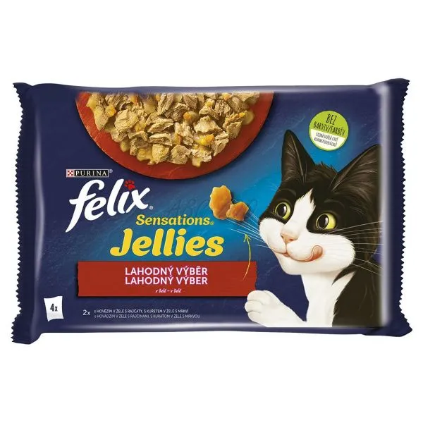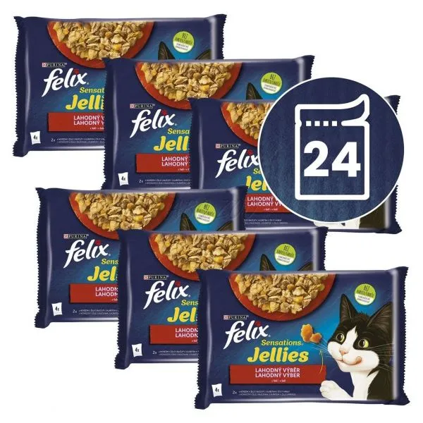 FELIX® Sensations® Jellies je rad neodolateľných krmív vyrobených z kvalitných surovín, ktoré výborne vyzerajú, voňajú a samozrejme lahodne chutia vašej mačke. Každé krmivo FELIX Sensations Jellies obsahuje krehké kúsky pre potešenie vašej mačky servírované v rôzne ochutených omáčkach pre mimoriadnu chuť a lákavú vôňu. Zároveň sú zdrojom omega-6 mastných kyselín a majú správnu kombináciu vitamínov, aby udržali vašu mačku plnú energie a pripravenú na neplechu! Sú plné dobrôt a uspokoja 100 % denných potrieb vašej mačky, keď sú podávané podľa návodu na kŕmenie. To nie je všetko! FELIX Sensations Jellies sú dostupné v celom rade kombinácií chutí v neodolateľných omáčkach! Takže, ak máte to šťastie mať tak senzačnú mačku ako je FELIX, uspokojte každý deň jej lásku po rozmanitosti s krmivom FELIX Sensations Jellies! FELIX je jednoducho neodolateľný!