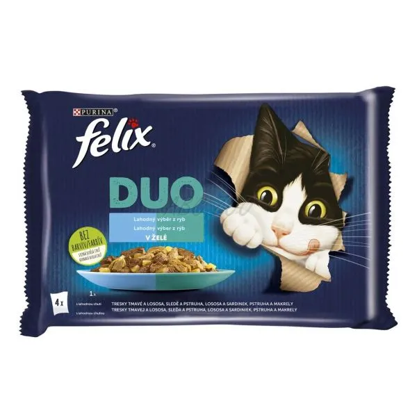 Kapsičky pre dospelé mačky Felix duo s delikátnymi rybami v želé - tmavá treska, losos, sleď, pstruh, sardinky a makrela.
