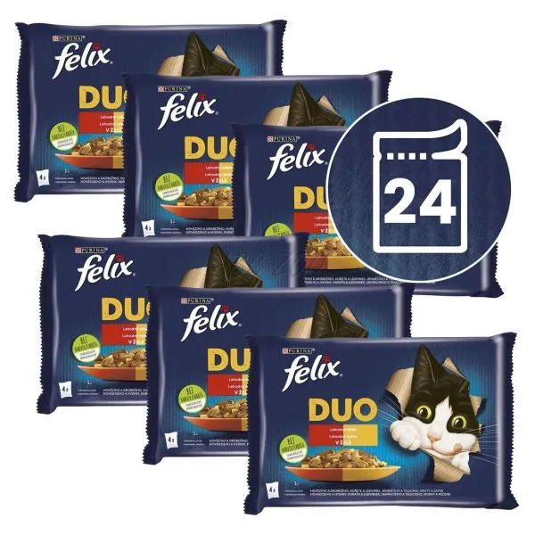 FELIX® Duo je rad neodolateľných krmív, ktoré vyzerajú, voňajú a chutia tak lahodne ako jedlo, ktoré by ste sami uvarili! Každá receptúra, vyrobená z kvalitných surovín, obsahuje krehké kúsky kombinujúce dve neodolateľné chute v želé. Tak si vaša mačka môže pochutnať na dvoch obľúbených chutiach naraz! Zároveň sú zdrojom omega-6 mastných kyselín a majú správnu kombináciu vitamínov, aby udržali vašu mačku plnú energie a pripravenú na neplechu! Sú plné dobrôt a uspokoja 100 % denných potrieb vašej mačky, keď sú podávané podľa návodu na kŕmenie. To nie je všetko! FELIX Duo je dostupný v celom rade neodolateľných receptúr v lahodnom želé, aby každý deň uspokojil lásku vašej mačky po rozmanitosti. Skutočne dvojnásobne vynikajúci! FELIX je jednoducho neodolateľný!