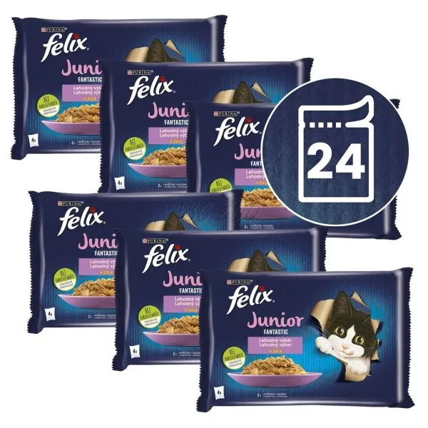 FELIX® Fantastic Junior je rad neodolateľných krmív, ktoré vyzerajú, voňajú a chutia tak lahodne ako jedlo, ktoré by ste sami uvarili! Každá receptúra, vyrobená z kvalitných surovín, obsahuje krehké kúsky v želé, aby sa vaše mačiatko mohlo do chutného krmiva poriadne zahryznúť! Mačiatka potrebujú, počas prvého roka ich života, špeciálnu výživu. Preto je každá receptúra špeciálne navrhnutá tak, aby pokryla 100 % denných potrieb vášho mačiatka. Sú plné bielkovín a vitamínov, aby pomohli rastu silných svalov, kostí a zubov pre šťastnú a nezbednú dospelú mačku! Pozri návod na kŕmenie. To nie je všetko! FELIX Fantastic Junior je dostupný v celom rade lahodných receptúr v šťavnatom želé, aby každý deň uspokojil lásku vášho mačiatka po rozmanitosti. Skutočne chutia tak dobre, ako vyzerajú! FELIX je jednoducho neodolateľný!