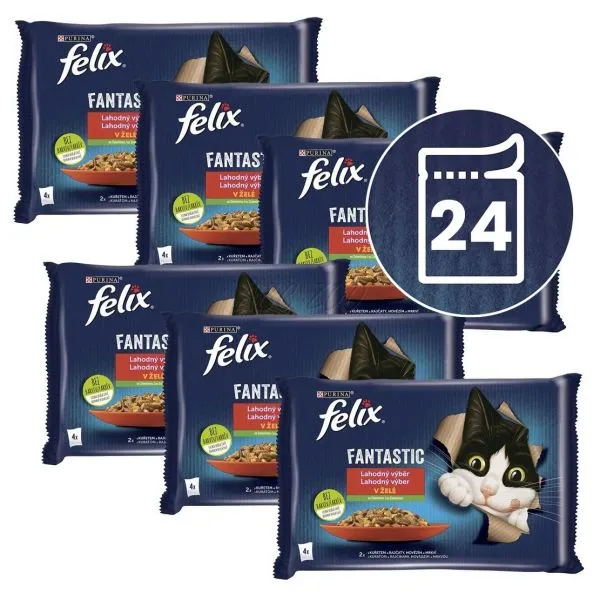 FELIX Fantastic je rad neodolateľných krmív, ktoré vyzerajú, voňajú a chutia tak lahodne ako jedlo, ktoré by ste sami uvarili! Každá receptúra, vyrobená z kvalitných surovín, obsahuje krehké kúsky v želé, aby sa vaša mačka mohla do chutného krmiva poriadne zahryznúť! Zároveň sú zdrojom omega-6 mastných kyselín a majú správnu kombináciu vitamínov, aby udržali vašu mačku plnú energie a pripravenú na neplechu! Sú plné dobrôt a uspokoja 100 % denných potrieb vašej mačky, keď sú podávané podľa návodu na kŕmenie. To nie je všetko! FELIX Fantastic je dostupný v celom rade lahodných receptúr v šťavnatom želé, aby každý deň uspokojil lásku vašej mačky po rozmanitosti. Skutočne chutia tak dobre, ako vyzerajú! FELIX je jednoducho neodolateľný!