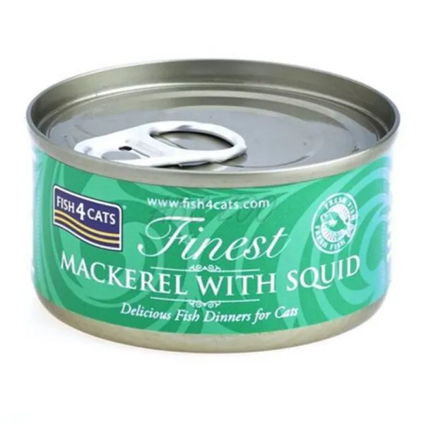 Fish4cats je jemné mäso z makrely a kalamára v konzerve pre mačky.
