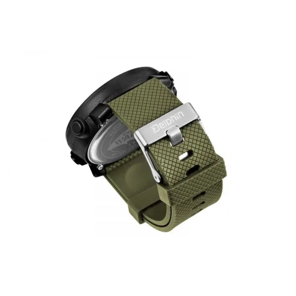 Delphin WADER sú digitálne hodinky pre každého, kto chce mať svoj čas vždy pod kontrolou. Svojím športovým dizajnom sa ideálne hodia aktívnym ľuďom, či už ide o rybárov, poľovníkov, turistov či športovcov. Okrem bežnej indikácie času disponujú niekoľkými skvelými funkciami ako budík, stopky, voliteľný 12 a 24H formát či duálny čas. Taktiež je možné pomocou tlačítka Light podsvietenie LCD displeja, vďaka čomu nestratíte pojem o čase ani počas nočných rybačiek, či iných aktivít. Gumené remienka sú na dotyk veľmi prijemne a taktiež sú dĺžkovo nastaviteľné v širokej škále. To zaručuje že sadnú na zápästie akejkoľvek hrúbky. Remienka sú navrhnuté v tmavo zelenej farbe čím ideálne zapadnú do prírodného prostredia bez toho, aby boli rušivým elementom. Samotné hodinky sú vyrobené z veľmi pevného čierneho materiálu, ktorý sa vyznačuje excelentnou odolnosťou voči mechanickému poškodeniu. Podľa medzinárodnej stupnice je tento model označený ako vodeodolný do 50m. Toto označenie spĺňa všetky náležitosti hodiniek, ktoré môžu byť vystavené tečúcej vode (napríklad sprchovanie), či pózovanie s úlovkom vo vode, kedy absolútne neprekáža ich ponáranie pod vodnú hladinu aj na dlhší čas. Delphin WADER sú jednoducho ideálny štýlový doplnok s nadupanými funkciami, vďaka ktorému budete mať vždy dokonalý prehlaď o čase.