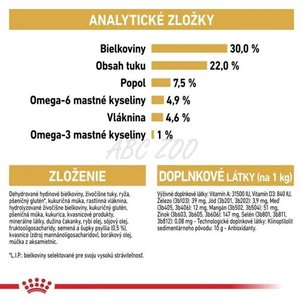 Analytické zložky: Proteín: 29,5% - Hrubá vláknina: 4,9% - Obsah tuku: 22,0% - Hrubý popol: 7,5% - Omega-6 mastné kyseliny: 4,9% - Omega-3 mastné kyseliny : 1 %.