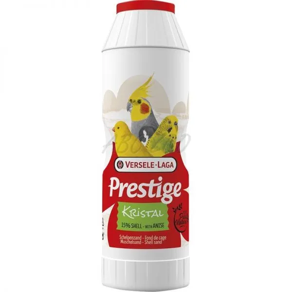 Prestige Shell Sand Kristal - biely mušľový piesok s anízom na podporu trávenia  pre exotické vtáctvo, sterilizovaný pri vysokej teplote. Piesok môžete nasypať do klietky alebo krmítka. Nie je vhodný pre holuby.
