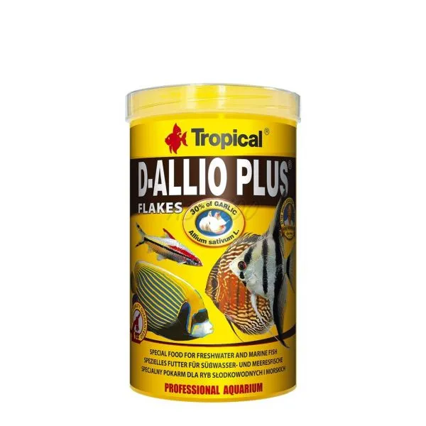 Vločky D-Allio Plus využívajú od dávna známe a cenné vlastnosti cesnaku (Alium sativum L.). Tento prírodný dodatok posiľňuje organizmus rýb a zlepšuje procesy trávenia. Vysoká výživná hodnota krmiva, optimálne vybraná zostava vitamínov a mikroelementov, ako aj prírodné vlastnosti cesnaku spôsobujú, že je to nezastupiteľné krmivo počas liečebných kúr, rekonvalescencie rýb a ich aklimatizácií na nové podmienky.