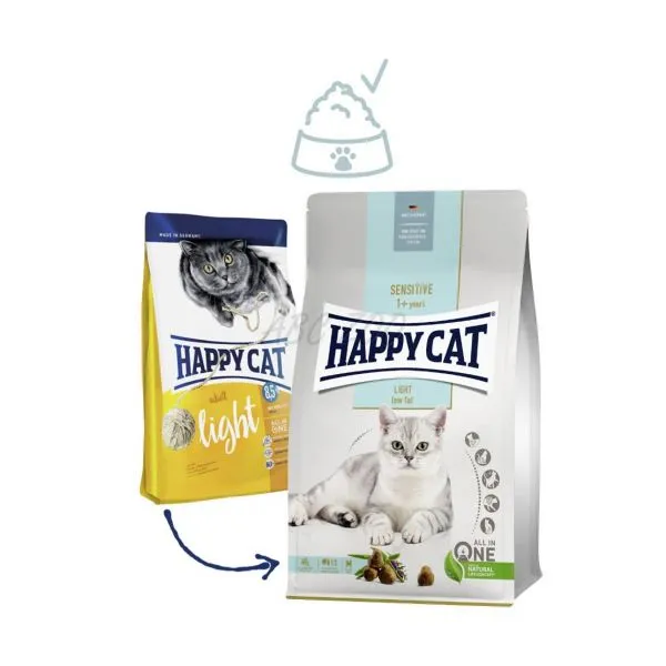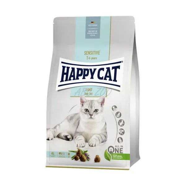 Happy Cat Sensitive Light  je kompletné krmivo pre dospelé mačky (od 1 roku) s miernou nadváhou alebo so sklonom k nadváhe.