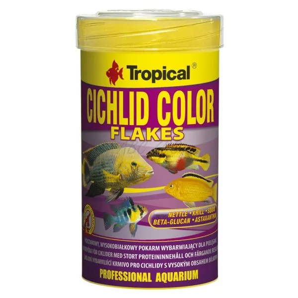 CICHLID COLOR je vyfarbujúce, vločkové krmivo s vysokým obsahom bielkovín pre denné kŕmenie všežravých a mäsožravých cichlíd, medzi nimi veľa druhov papuľovcov z jazera Malawi.