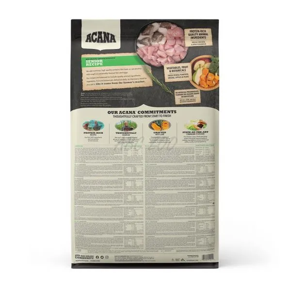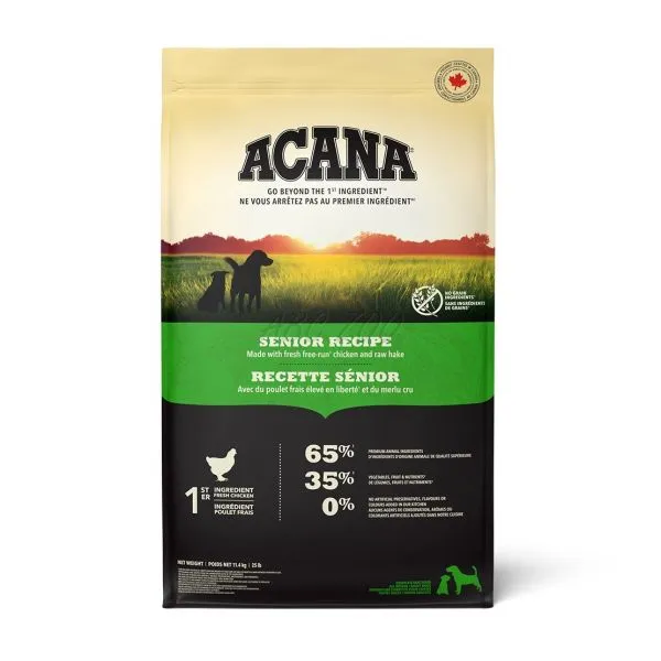 Acana Senior je kompletné krmivo určené pre starších psov od 7 rokov. Krmivo obsahuje vysoké množstvo proteínov na podporu svalovej hmoty a nízky obsah sacharidov, ktoré predchádzajú obezite a cukrovke.