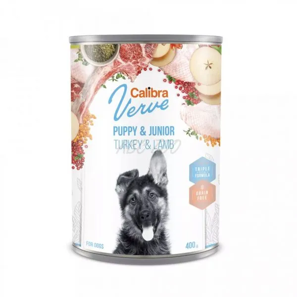 Konzerva Calibra Verve s morčacím a jahňacím mäsom pre šteňatá a juniorov.