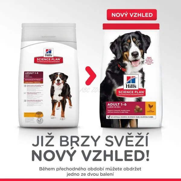 Veľké psy majú špecifické nutričné potreby, preto má Hill's Science Plan krmivo pre dospelých psov veľkých plemien s kuračom špeciálne zloženie pre naplnenie energetických potrieb psov veľkých plemien behom najlepších rokov života. Toto krmivo pre veľkých dospelých psov je vyrobené z vysoko kvalitných, ľahko stráviteľných ingrediencií, obsahuje vysoko kvalitné bielkoviny pre tvorbu svalovej hmoty, ďalej glukozamín a chondroitin pre zdravé kĺby a mobilitu. Vyvážená zmes omega-6 a vitamínu E vyživuje kožu pre zdravú a lesklú srsť. S novým vzhľadom Science Plan sa máte na čo tešiť. Niektoré naše produkty teraz naviac majú nové meno, tvar granúl a receptúru.