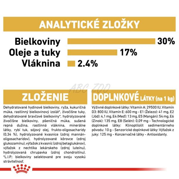 Zloženie: Dehydratované hydinové mäso, ryža, kukuričná múka, izolát rastlinného proteínu (L.I.P.: proteín vybraný vďaka svojej vysokej stráviteľnosti), živočíšne tuky, dehydratované bravčové mäso, hydrolyzované živočíšne proteíny, pšeničná múka, repné odrezky, rastlinná vláknina, minerály, rybí olej, sójový olej, fruktooligosacharidy (0,34 %), hydrolyzované kvasnice (zdroj mannánoligosacharidov), hydrolyzované kôrovce (zdroj glukozamínu), výťažky z kvasníc (zdroj betaglukánov), výťažok z nechtíka lekárskeho (zdroj luteínu), hydrolyzované chrupavky (zdroj chondroitínu).