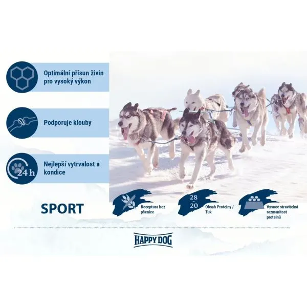 • obsah energie krmiva SPORT NORDIC je prispôsobený extrémne zvýšeným potrebám pracujúcich psov