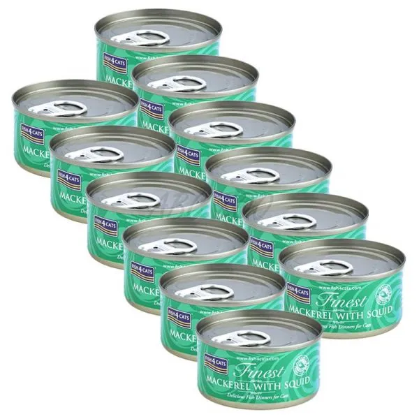 Fish4cats je jemné mäso z makrely a kalamára v konzerve pre mačky.