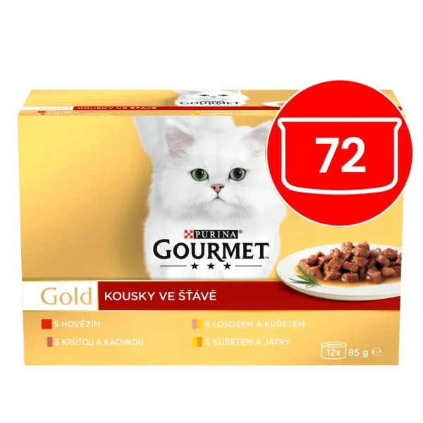 Gourmet Gold konzervy pre mačky hovädzie, morka a kačica, losos a kura, kura a pečeň v šťave 72x85 g