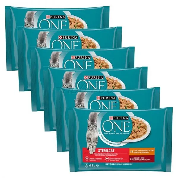 PURINA ONE STERILCAT kapsičky - multibalenie s kuraťom a zelenými fazuľkami v šťave, s hovädzím a mrkvou v šťave.