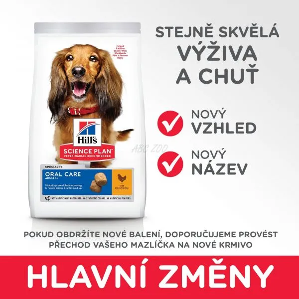 Dentálne zdravie psa znamená viac ako len zuby. Podporte celkové zdravie a vitalitu vášho dospelého psa krmivom Hill's Science Plan Oral Care pre dospelých psov s kuraťom. Unikátne granule s klinicky overenou, previazanou technológiou vlákniny s každým uhryznutím čistí zuby a osviežuje dych. Naviac má toto prvotriedne psie krmivo vysoký obsah omega-6 mastných kyselín a vitamínu E pre každodennú podporu zdravej srsti a kože. Táto receptúra bola vytvorena na základe desaťročného špičkového výskumu a predstavuje lahodnú stravu, na ktorej si dospelé psy skutočne pochutia. S novým vzhľadom Science Plan sa máte na čo tešiť. Niektoré naše produkty teraz naviac majú nové meno, tvar granúl a receptúru.