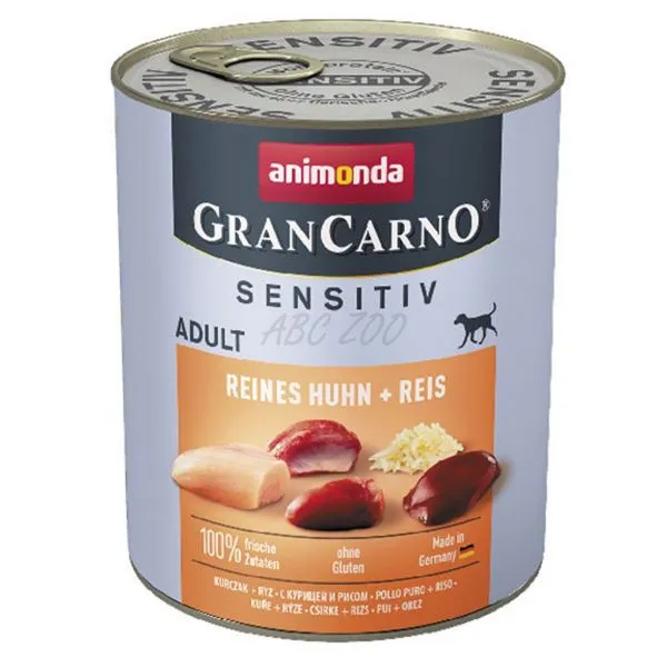 Animonda GranCarno Sensitiv Adult je konzerva s kuracím mäsom a ryžou pre dospelé psy všetkých plemien s citlivým trávením.