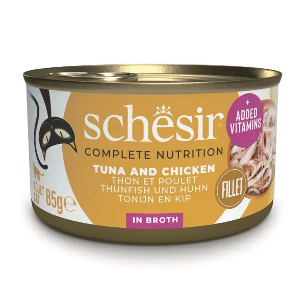 Schesir je lahodná konzerva pre dospelé mačky, plná tuniaka, kuracieho mäsa a ryže vo vývare.