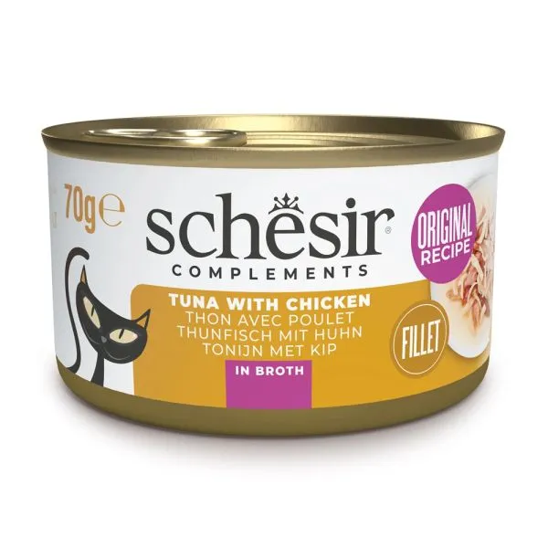 Schesir je lahodná konzerva pre dospelé mačky, plná tuniaka a kuracieho mäsa vo vlastnom vývare.