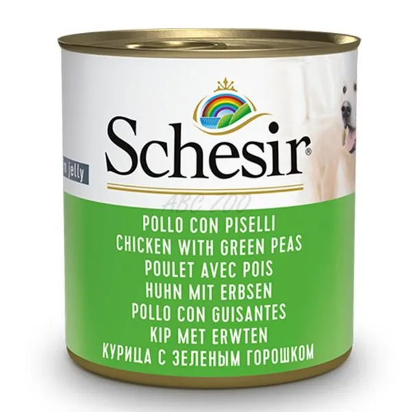Schesir je prírodné krmivo v konzerve z kuracieho mäsa s hráškom pre všetky plemená psov.