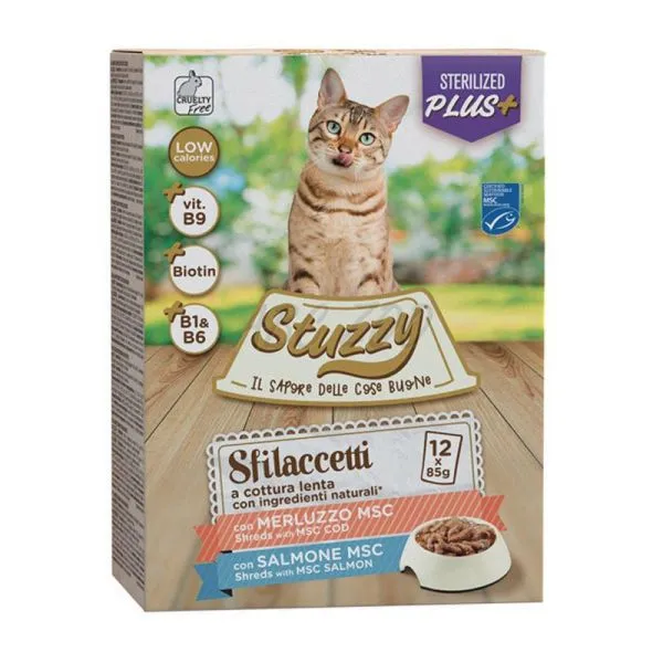 Stuzzy Cat Shreds Sterilized je krmivo zo šťavnatých kúskov mäsa s nízkym obsahom kalórií určené pre kastrované mačky.