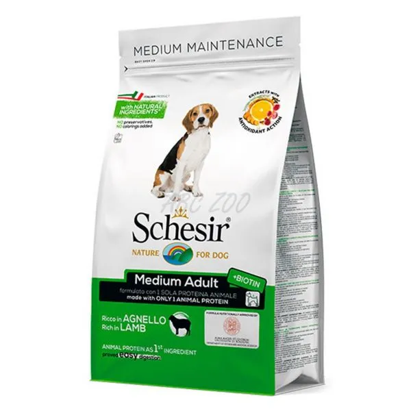 Schesir je prírodné monoproteínové krmivo s jahňacím mäsom a ryžou pre stredné plemená dospelých psov.