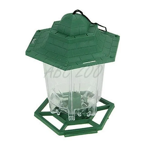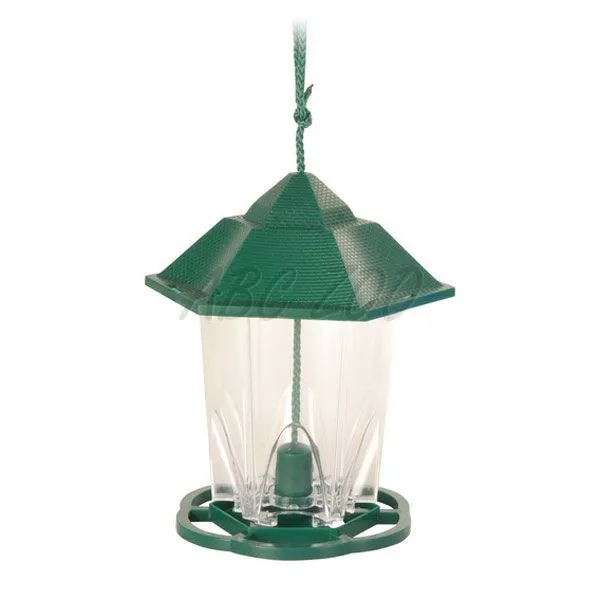 Plastové kŕmidlo pre vtáky so zelenou odnímateľnou strieškou a pristávacou plochou. Udržuje potraviny suché a čisté.