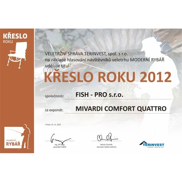 Skvele navrhnuté kreslo, ktoré plní priania mnohých rybárov. Je vybavené anatomicky tvarovaným operadlom a silne polstrovaným neoprénovým vankúšom. Všetky štyri nohy sú teleskopické, vybavené spoľahlivou aretáciou a veľkými pätkami proti zaboreniu. Konštrukcia je stabilná, prekvapivo ľahká a veľmi pevná (nosnosť 160 kg). Kreslo ponúka pohodlný systém naklápania operadla pri nadvihnutí opierok na ruky.