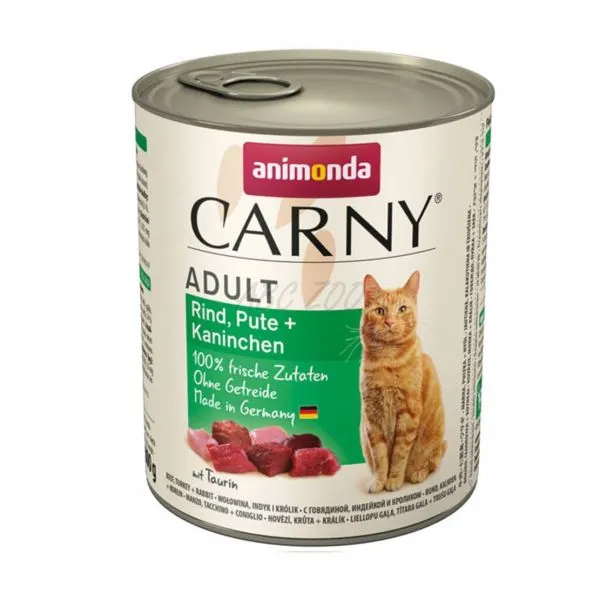 Animonda konzerva pre dospelé mačky s obsahom hovädzieho, morčacieho a králičieho mäsa.