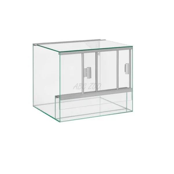 Sklenené terárium s dvierkami, ktoré sú odsúvateľné pre jednoduchú obsluhu terária a maximálnu bezpečnosť pre zvieratá.