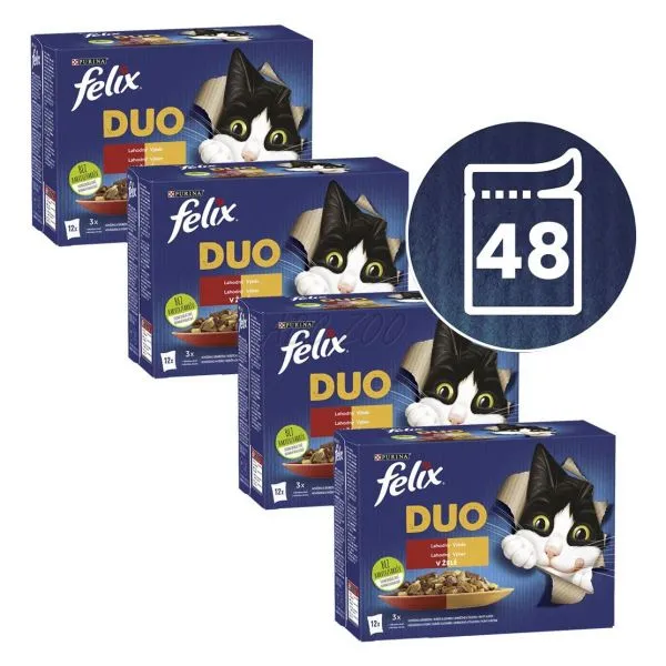 FELIX® Duo je rad neodolateľných krmív, ktoré vyzerajú, voňajú a chutia tak lahodne ako jedlo, ktoré by ste sami uvarili! Každá receptúra, vyrobená z kvalitných surovín, obsahuje krehké kúsky kombinujúce dve neodolateľné chute v želé. Tak si vaša mačka môže pochutnať na dvoch obľúbených chutiach naraz! Zároveň sú zdrojom omega-6 mastných kyselín a majú správnu kombináciu vitamínov, aby udržali vašu mačku plnú energie a pripravenú na neplechu! Sú plné dobrôt a uspokoja 100 % denných potrieb vašej mačky, keď sú podávané podľa návodu na kŕmenie. To nie je všetko! FELIX Duo je dostupný v celom rade neodolateľných receptúr v lahodnom želé, aby každý deň uspokojil lásku vašej mačky po rozmanitosti. Skutočne dvojnásobne vynikajúci! FELIX je jednoducho neodolateľný!