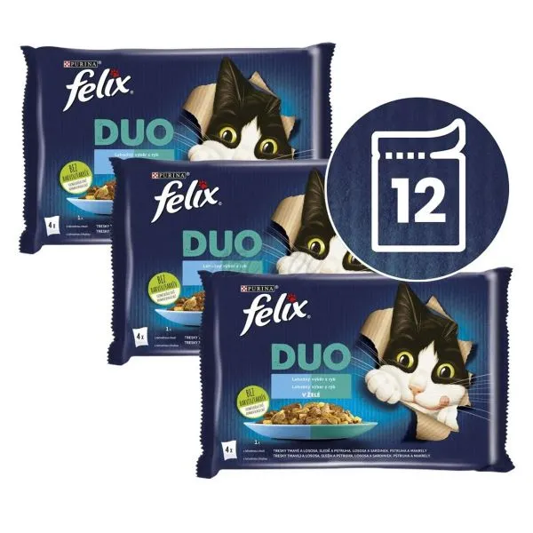 Kapsičky pre dospelé mačky Felix duo s delikátnymi rybami v želé - tmavá treska, losos, sleď, pstruh, sardinky a makrela.