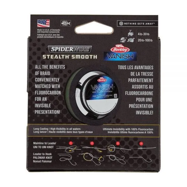 Akú veľkosť rybárskeho nadväzca použiť s mojím obľúbeným priemerom šnúry? Táto jedinečná nová koncepcia dvojitého opletu a fluorokarbónovej cievky od Spider Wire vám ponúka dobre vyváženú kombináciu hlavného vlasca a nadväzca v jednom balení! Malú cievku z fluorokarbónového nadväzca Vanish ľahko zafixujete do väčšej cievky osvedčenej pletenej hlavnej šnúry Stealth Smooth 8. Kombinácie sú ideálne pre rôzne dravé ryby ako zubáč, ostriež, pstruh a morský vlk.