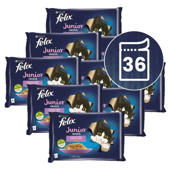 FELIX® Fantastic Junior je rad neodolateľných krmív, ktoré vyzerajú, voňajú a chutia tak lahodne ako jedlo, ktoré by ste sami uvarili! Každá receptúra, vyrobená z kvalitných surovín, obsahuje krehké kúsky v želé, aby sa vaše mačiatko mohlo do chutného krmiva poriadne zahryznúť! Mačiatka potrebujú, počas prvého roka ich života, špeciálnu výživu. Preto je každá receptúra špeciálne navrhnutá tak, aby pokryla 100 % denných potrieb vášho mačiatka. Sú plné bielkovín a vitamínov, aby pomohli rastu silných svalov, kostí a zubov pre šťastnú a nezbednú dospelú mačku! Pozri návod na kŕmenie. To nie je všetko! FELIX Fantastic Junior je dostupný v celom rade lahodných receptúr v šťavnatom želé, aby každý deň uspokojil lásku vášho mačiatka po rozmanitosti. Skutočne chutia tak dobre, ako vyzerajú! FELIX je jednoducho neodolateľný!